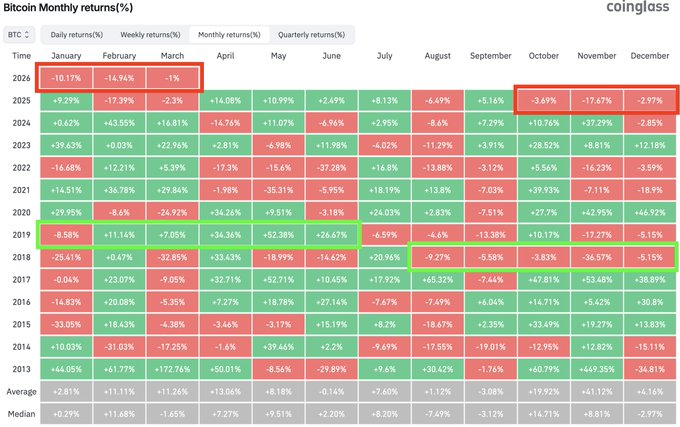 Nếu tháng 3 kết thúc trong sắc đỏ, điều đó sẽ đánh dấu tháng thứ 6 liên tiếp BTC giảm giá. Điều đó chỉ xảy ra một lần duy nhất trong lịch sử Bitcoin. Lần trước khi điều đó xảy ra, 5 tháng tiếp theo đều xanh tươi. Và BTC đã tăng hơn 300%, từ 3.400 đô la lên 11.000 đô la.
