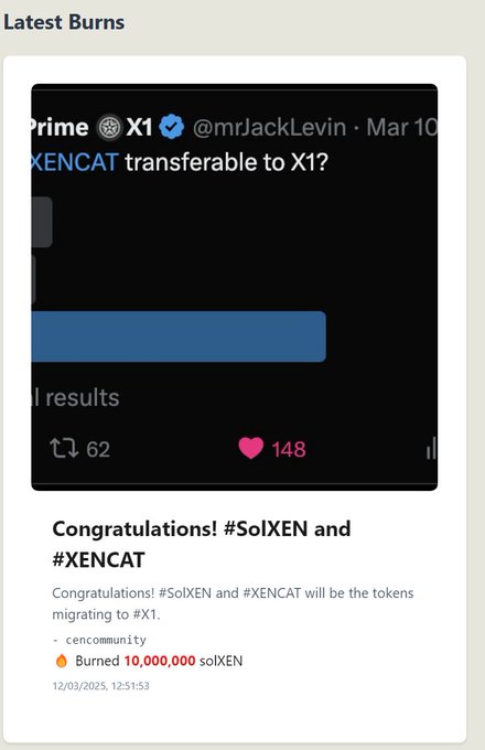 + 10,000,000 <Token> đã bị đốt. ============== Chúc mừng! #<SOL>XEN và #<ONG>CAT sẽ là các <Token> di chuyển đến #<UNI>X1. - @cencommunity 🔥 Đã đốt 10,000,000 <Token> 12/03/2025, 12:51:53 ==============
