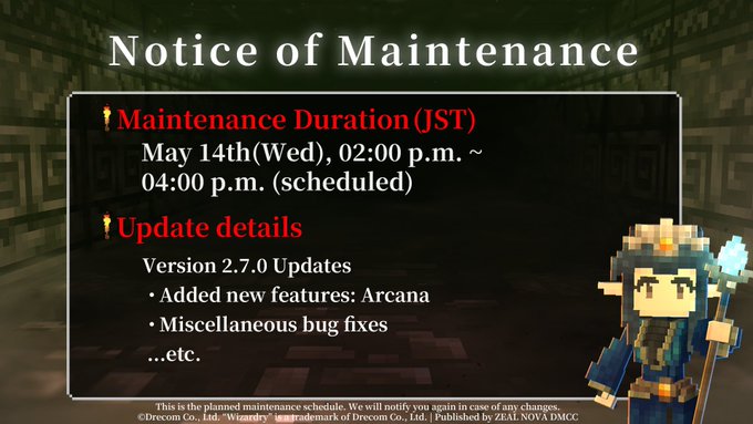 Như đã thông báo trước đó, tất cả các dịch vụ cho "Eternal Crypt - Wizardry BC -" sẽ kết thúc vào Thứ Hai, ngày 15 tháng 12 năm 2025, lúc 16:00 giờ JST.