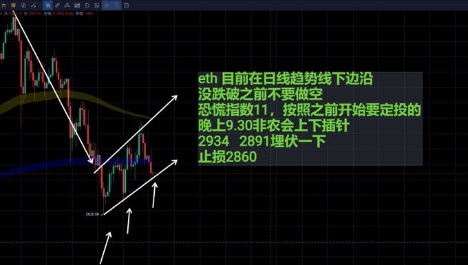 Không nên short ETH cho đến khi giá phá vỡ xuống dưới cạnh dưới của đường xu hướng hàng ngày. Với chỉ số sợ hãi ở mức 11, dựa trên chiến lược bình quân giá theo thời gian trước đó, hãy cân nhắc đặt lệnh mua quanh mức 2934-2891 sau báo cáo việc làm phi nông nghiệp lúc 9:30, với điểm cắt lỗ ở mức 2860. Đồng thời, hãy cân nhắc đặt một lệnh mua nhỏ.