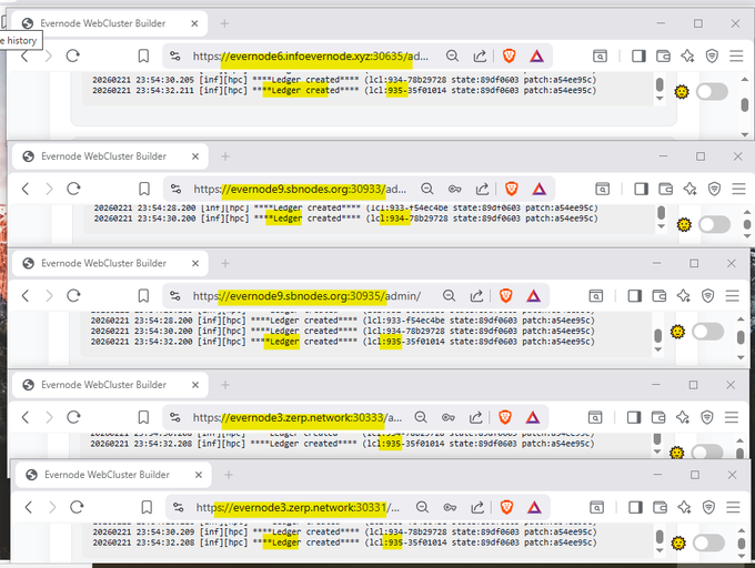 5 nút khác nhau đạt được sự đồng thuận trên Evernode @EvernodeXRPL, hãy xem số Ledger giống nhau trên 5 nút vì nó được tạo ra sau khi đạt được Consensus về nội dung/tệp/dữ liệu được bỏ phiếu. Phi tập trung! Evernode + Xahau