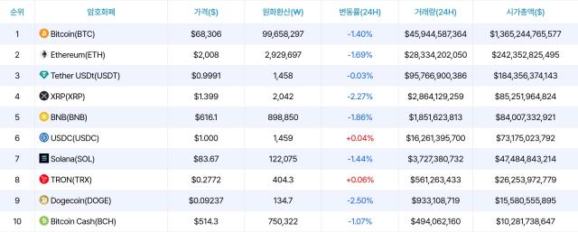 [Bản tin thị trường nửa đêm] Thị trường crypto đang có xu hướng giảm… Bitcoin 68.448 đô la, Ethereum ở mức 2.005 đô la
