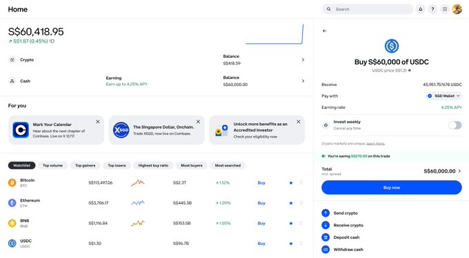 Coinbase cho phép bạn kết nối liền mạch nhiều token khác nhau như SGD, USDC, BTC/ETH, v.v. mà không cần lo lắng về việc tài khoản ngân hàng của bạn bị đóng băng.