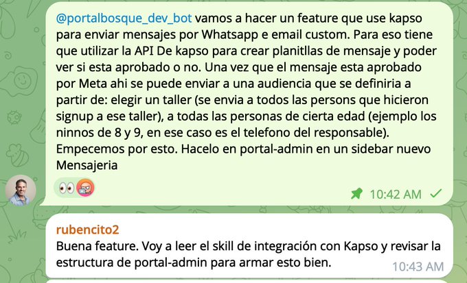 Tôi yêu cầu một trong những cộng sự của mình tạo một mẫu tin nhắn WhatsApp bằng API của Kapso, sau đó thống nhất nội dung tin nhắn và các biến số, rồi xác định đối tượng (trẻ em 8-9 tuổi, đã đăng ký hoạt động X) và cuối cùng gửi một tin nhắn thử nghiệm đến số điện thoại của tôi.