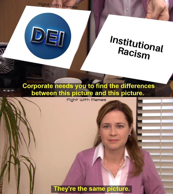 Việc bãi bỏ DEI không phải là để giữ "đàn ông da trắng nắm quyền". Mà là để ngăn chặn những người bất tài lên nắm quyền chỉ vì họ thuộc nhóm thiểu số. DEI phá hủy mọi thứ mà nó chạm vào. twitter.com/FightWithMemes/sta...