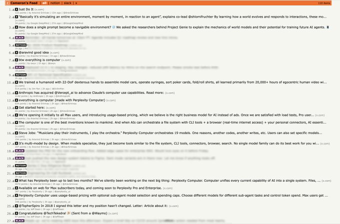 Tuần trước, tôi đã nhờ Perplexity Computer xây dựng cho tôi một trang Hacker News cá nhân. Trang này cập nhật suốt cả ngày, lấy thông tin từ Slack, Notion, X và tin tức chung. Thú vị (và hữu ích) hơn nhiều so với việc cuộn qua các thông báo.
