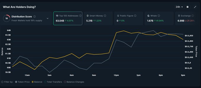 Theo @nansen_ai, trong 24 giờ qua, Top 100 địa chỉ đã tăng vị thế của họ lên 4%, Smart Money tăng 1.23%, và các cá voi tăng 41%