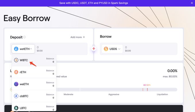 @sparkdotfi hỗ trợ vay mượn tất cả stablecoin bằng wBTC, trong đó USDC, USDT, USDS, pyUSD, v.v.