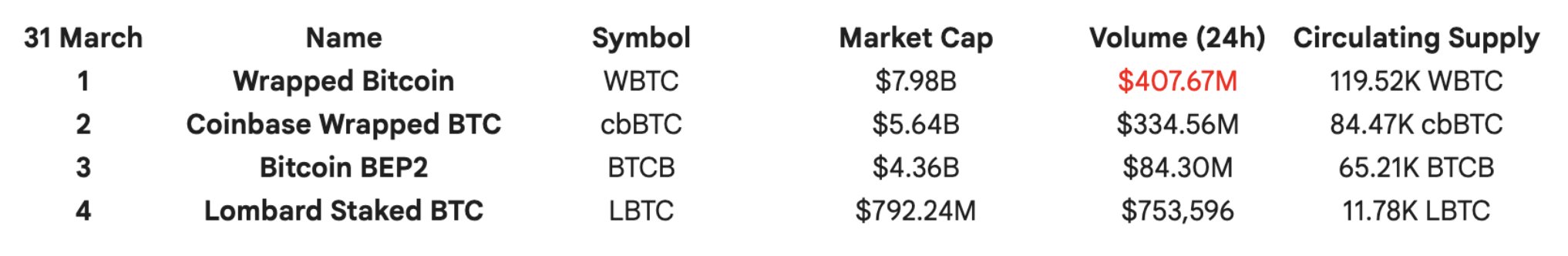 Theo dữ liệu, wBTC và cbBTC nằm trong top 2 về thanh khoản trong số tất cả các loại BTC được đóng gói. Trong 24 giờ qua, khối lượng giao dịch của wBTC đạt 407 triệu đô la.