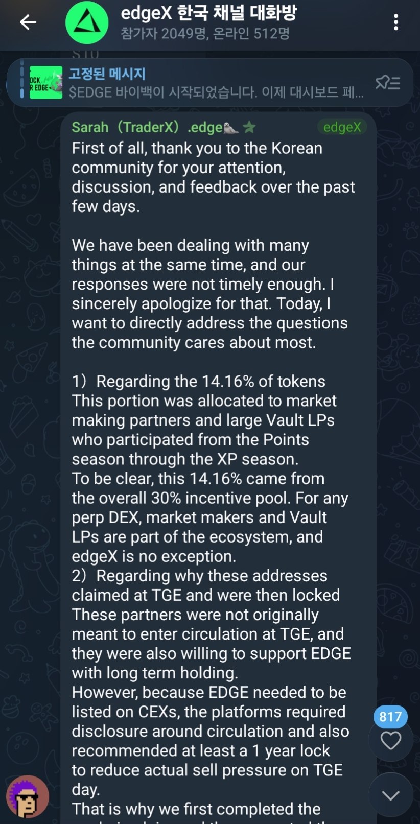 Chúng tôi xin lỗi nếu các bạn thất vọng. Tuy nhiên, nếu các bạn vẫn sẵn lòng tiếp tục theo dõi edgeX, chúng tôi sẽ chứng minh điều đó bằng hành động. Và như tôi đã đề cập trước đó, nếu giá trị airdrop của các bạn thấp hơn số tiền các bạn đã trả, vui lòng liên hệ trực tiếp với tôi.