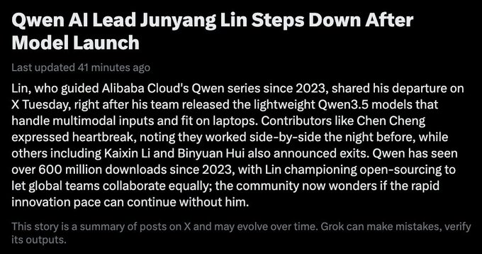 Lin được xem là nhà phát triển quan trọng nhất tại Qwen. Ông cũng là người ủng hộ mạnh mẽ mã nguồn mở. Sự ra đi của ông dẫn đến nhiều đồn đoán rằng ông bị buộc phải rời đi trái với ý muốn. Các nhà nghiên cứu trí tuệ nhân tạo người Trung Quốc You Jiacheng và Chen Cheng cũng có cùng quan điểm này.