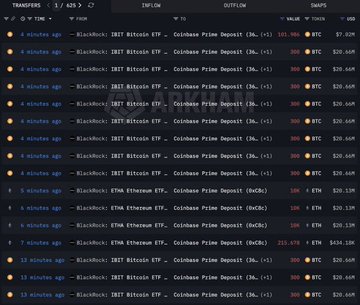 BlackRock chuyển thêm 3.402 $BTC và 30.216 ETH sang Coinbase để thanh toán ETF.