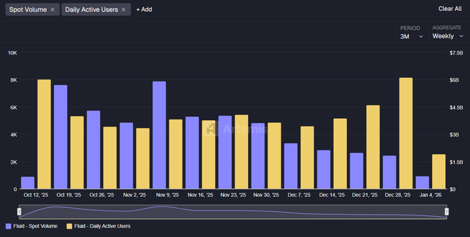 Đà tăng trưởng mạnh mẽ cuối năm của @0xfluid, chứng kiến sự tăng vọt về số người dùng hoạt động hàng ngày trong tháng 12 năm 2025.