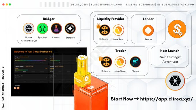 Tôi đã sử dụng mạng chính của @citrea_xyz được một tuần và đó là một trong những trải nghiệm mượt mà nhất mà tôi từng có. Họ đang triển khai chiến dịch mạng chính với chương trình Early Adopter Boost! Trên bảng điều khiển Citrea, bạn có thể quản lý mọi thứ bằng cách chọn một danh mục: — Bridger Cho phép bạn kết nối với Citrea bằng nhiều phương pháp khác nhau: ▸ Native Bridge Hub / Clementine CLI ▸ @symbiosis_fi ▸ @atomiqlabs ▸ @StargateFinance — Nhà cung cấp thanh khoản Theo dõi phạm vi NHÀ CUNG CẤP THANH KHOẢN và các cặp tài sản của bạn theo thời gian trên @SatsumaDEX (họ có chương trình tích điểm riêng) và @JuiceSwap_com. — Nhà giao dịch Theo dõi hoạt động giao dịch của bạn trên Satsuma, JuiceSwap và @FibrousFinance. — Bên cho vay Theo dõi hoạt động cho vay của bạn trong khoảng thời gian $ctUSD trên @ZentraFinance. Mỗi hành động đều góp phần vào thanh tiến độ, và cho đến nay, tôi khá hài lòng với tiến độ của mình ở cấp độ Nhà thám hiểm. Và đó chưa phải là tất cả, hai danh mục nữa, Chiến lược gia lợi nhuận và Nhà thám hiểm, cũng sẽ sớm ra mắt.