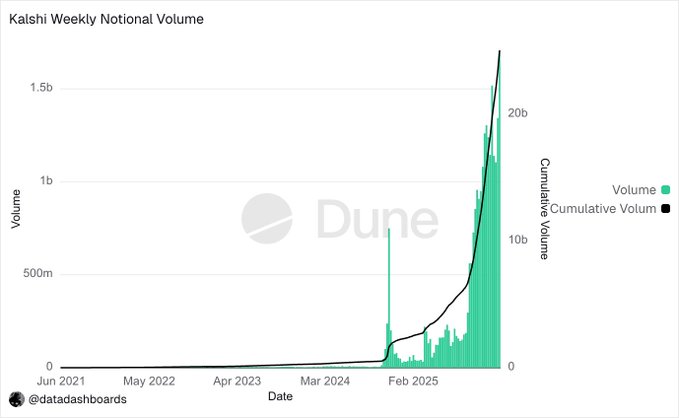 @Kalshi vừa đạt khối lượng giao dịch hàng tuần vượt mốc 1,7 tỷ đô la lần đầu tiên, nâng tổng khối lượng giao dịch tích lũy của họ lên hơn 25 tỷ đô la.