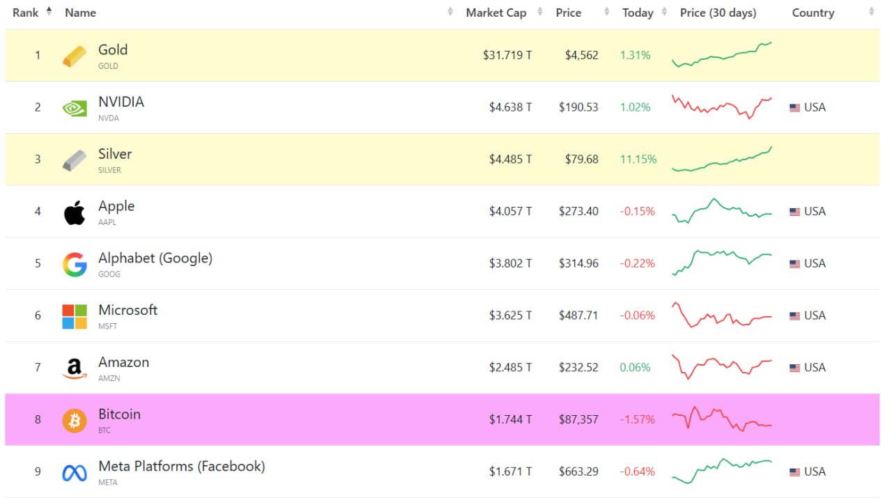 Mới ngày nào đây BTC vượt qua bạc. Hiện tại bạc top 3, BTC top 8 🥲