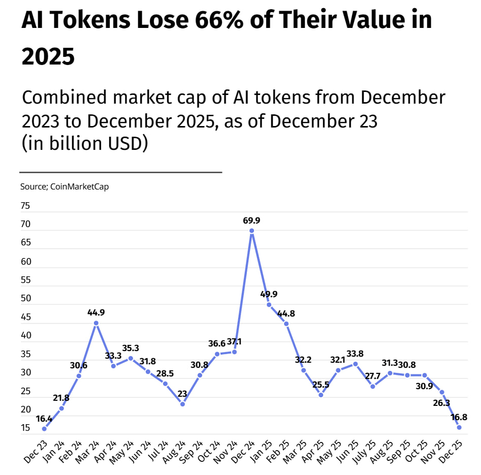 Từng được ca ngợi là "rất tiềm năng", vốn hóa AI Token đã mất 66% giá trị, bốc hơi đến hơn 53 tỷ đô trong 2025. Còn ae nào đang hold con hàng khủng bố WLD không 😂?