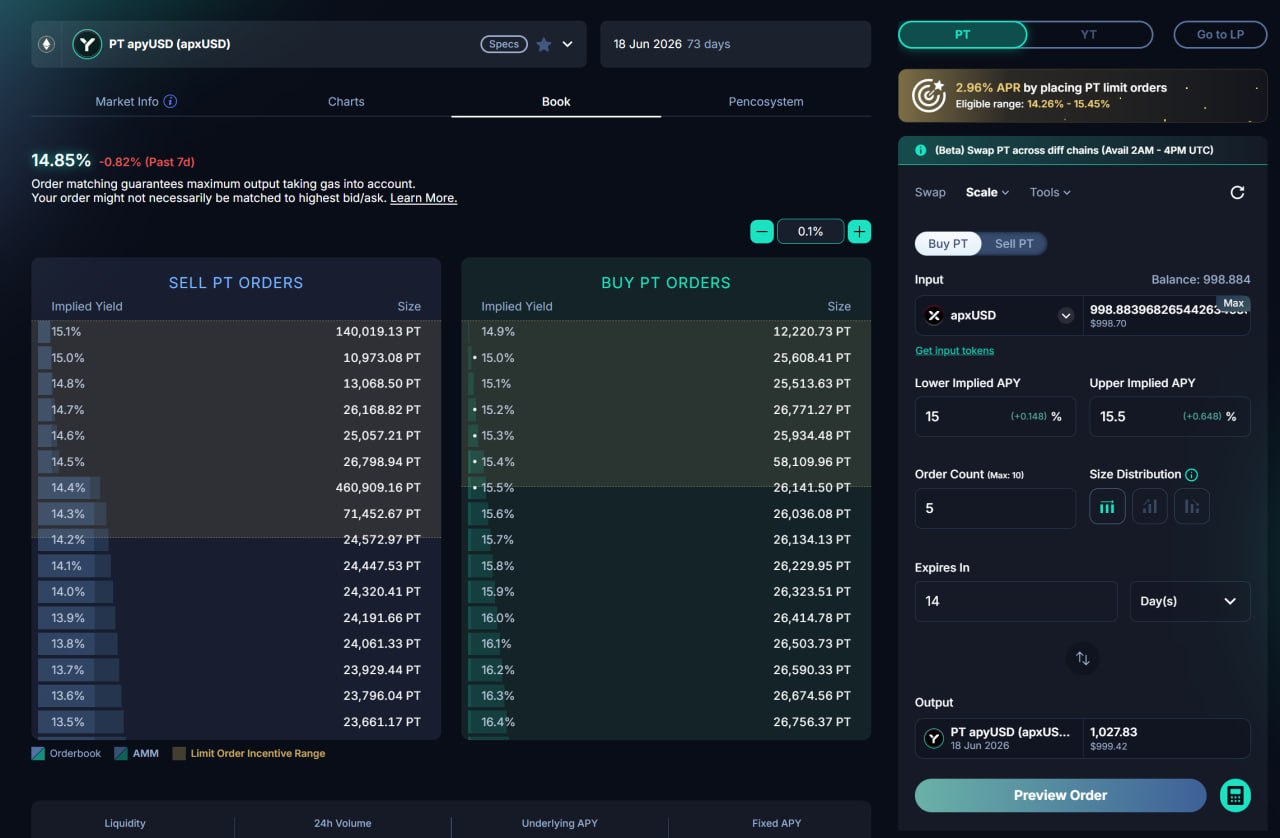 - Một hệ thống đã được giới thiệu, trong đó việc đặt lệnh giới hạn (LO) sẽ trả lãi suất bằng token PENDLE.