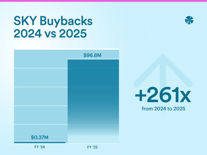 Năm 2025, SKY đã được mua lại với tổng giá trị 96,8 triệu đô la, tương đương với việc loại bỏ 1,55 tỷ token khỏi lưu thông. Con số này tăng gấp 261 lần so với năm 2024.