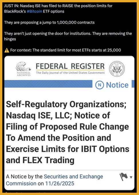 纳斯达克为贝莱德比特比特币ETF扩展 🔸纳斯达克提议将IBIT期权合约限额从标准的25,000份上涨到1,000,000份。 🔸 这使得机构可以通过贝莱德的ETF大规模交易比特币。 🔸 IBIT 目前是全球未平仓合约量最大的比特币期权市场 纳斯达克比特币阅读具有足够的流动性和稳定性,可以像市场上最大的股票一样进行交易。