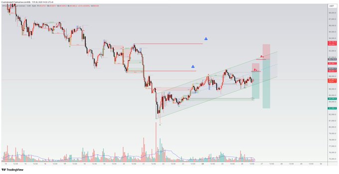 什么是顺大逆小?典型案例来了! 从81K反弹至今,BTC和ETH都在小时图走成了标准的上升通道,这个通道怎么玩呢? 小级别来看:这是右侧的上涨通道,可以围绕上下沿低多高卖,什么时候打破通道结构,什么时候改变思路 从4小时以上级别看,这个上升通道可以看成中期下跌趋势的旗形结构,中期趋势交易是寻找上沿区域做空,什么时候形成4小时级别的强势突破通道,什么时候离场改变思路。 以上是形态结构的交易运用。 除了看结构还要看盘口数据方面,这几天底部通道上行过程中,成交量减弱,CVD没有同步上升,OI持仓量上升平平,属于多空博弈过程 按照顺大逆小原则,顺中期下跌趋势,逆小级别上行通道趋势,在通道内上沿逢高布局空单就是“顺大逆小”的运用 这也是这几天交易计划中的思路,日内继续维持88.8K-89.6K做空,极限通道上沿补仓90.6K,跌破85.3K才是跌破通道寻找新的二次探底结构支撑。以太同步大饼的上沿做空区域在2980-3040。 那如果4小时强势突破了91K并在4小时中持续站稳,则需要择机调整空头思路切换回踩做多为主。 #BTC #ETH
