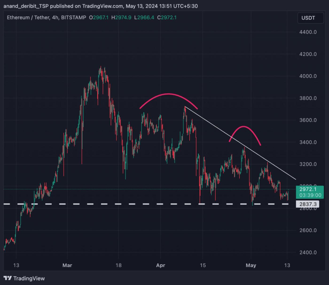 如所附的 4 小时以太坊价格图所示, ETH目前正处于下行趋势,其特点是其形成阶段的高点较低,交易价格接近其支撑位 2850 美元。美国证券交易委员会在 5 月 23 日批准ETH ETF 的可能性非常小,而 2024 年批准 ETF 的可能性似乎也不确定。此外,与BTC相比,在香港推出的ETH ETF 仅吸引了约 10% 的流入,这表明投资者情绪谨慎。因此,交易者可以考虑部署看跌看涨价差策略,以利用ETH预期的横盘下行趋势。