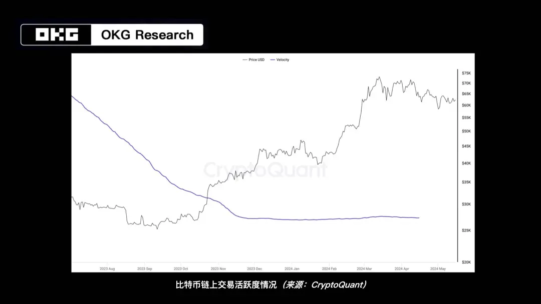 (说明:Velocity 是衡量单位在网络中流通速度的指标,该值越高表明比特币链上流转速度越快,交易活跃度越高。)