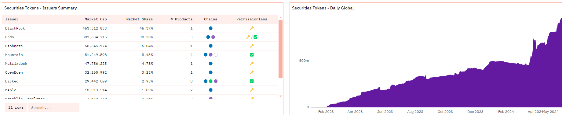 若单纯以代币化证券来衡量,根据 Dune Analytics 数据显示,代币化证券 (包含债券和投资债券的 ETF) 市值自 2023 年 2 月持续成长,目前市值已超过 9.68 亿美元。第一名是今年才加入的华尔街巨头贝莱德,其 BUIDL 市值已有 4.5 亿美元,占代币化证券总体市值的 45%,而第二名则是 Ondo,市值达 3.03 亿美元。