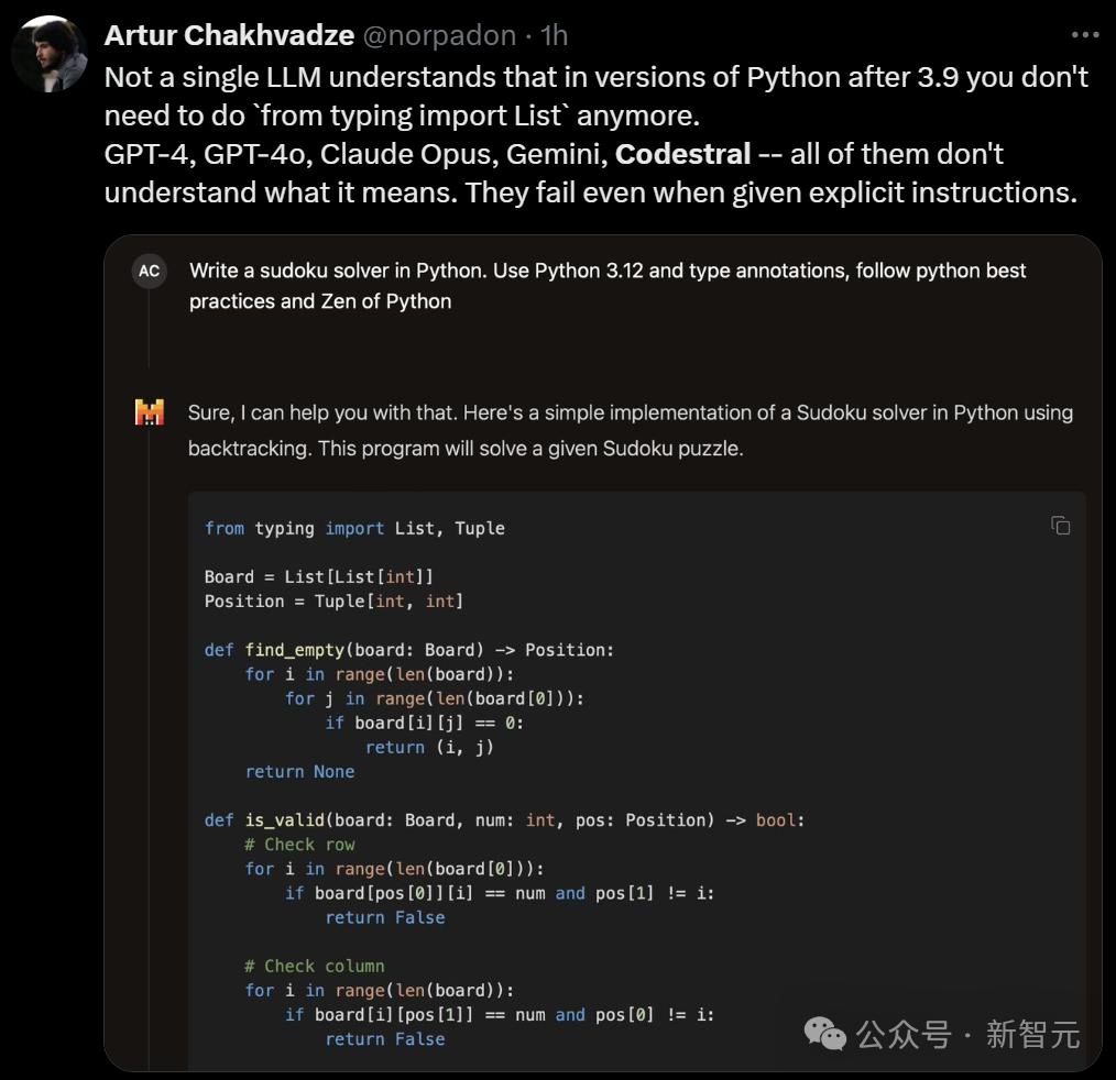 但也有Python工程师吐槽:「没有一个LLM明白,在Python 3.9之后的版本中,就不再需要使用from typing import List了。」