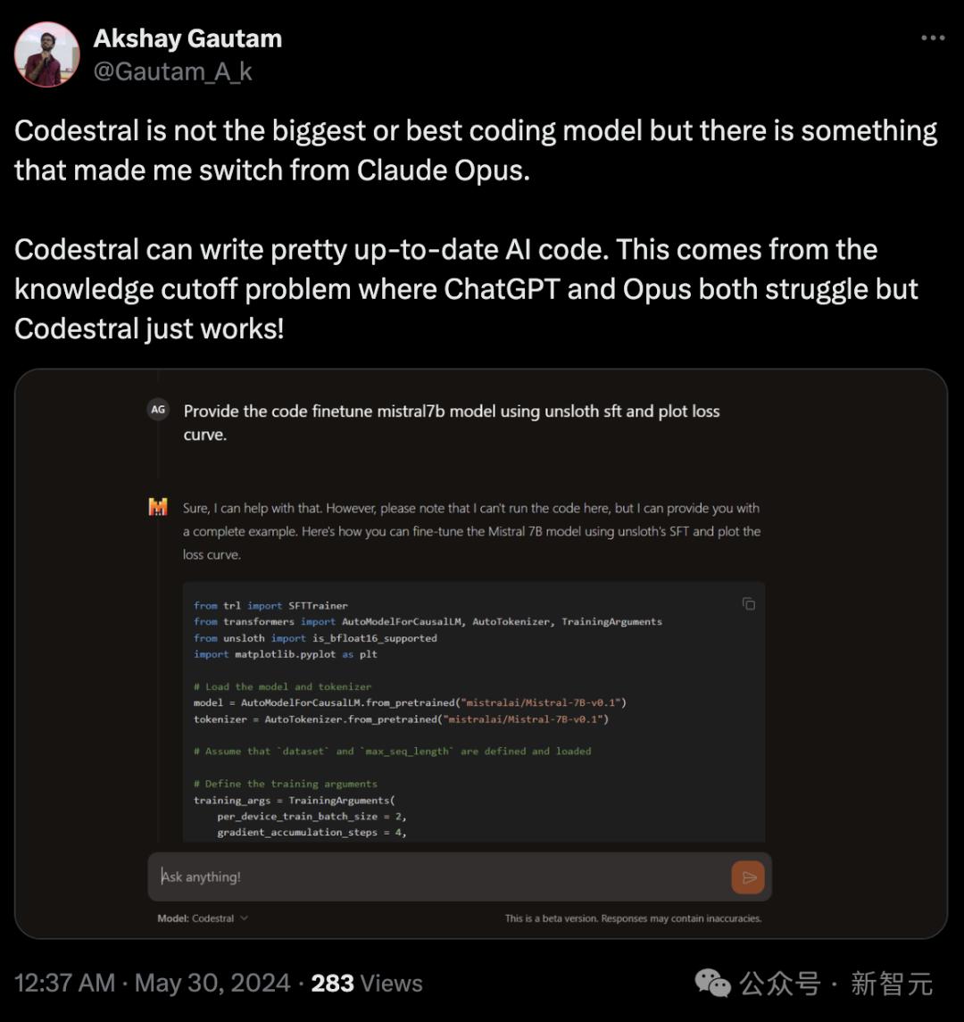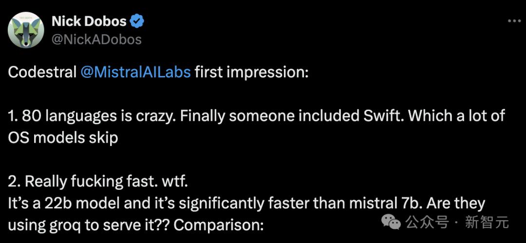 有开发者分析,虽然Codestral不是最大、最好的代码模型,但自己还是会从Claude Opus爬墙,改用Codestral。