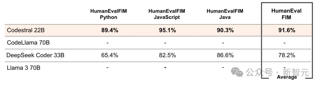 在FIM任务中,Codestral用更少的参数量,在Pyhon、JavaScript和Java三种语言上的分数全面超过DeepSeek Coder 33B。
