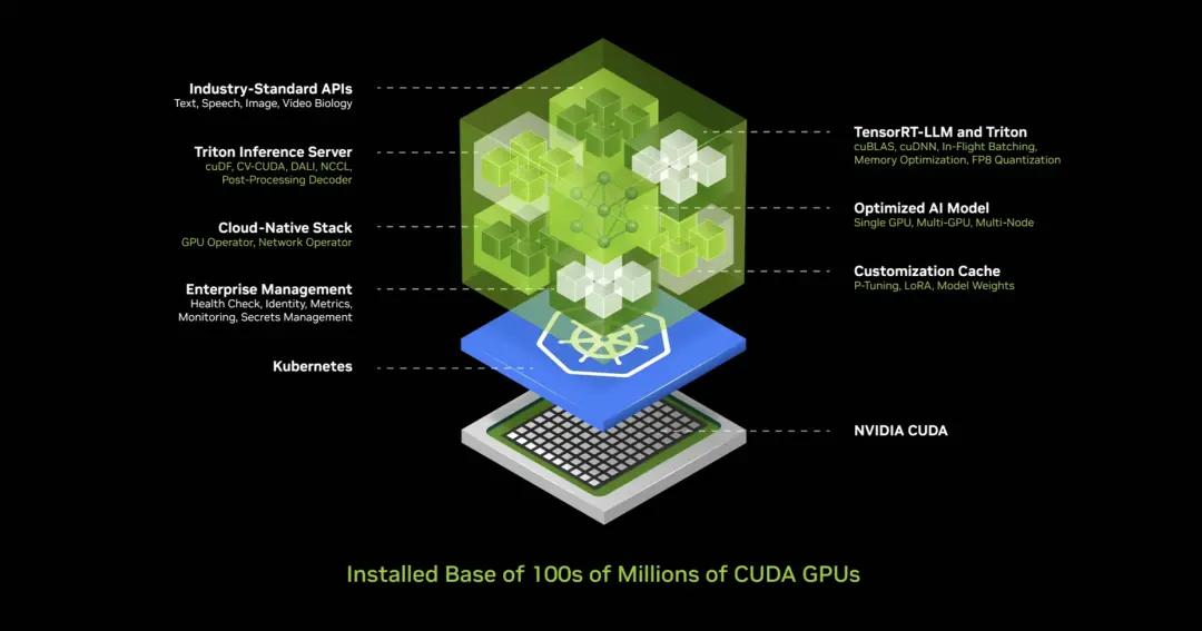 所以英伟达做了什么?英伟达创建了这个 AI 盒子,这个容器里装满了大量的软件,这个容器内部包括 CUDA、cuDNN、TensorRT、Triton 推理服务。它是云原生的,可以在 Kubernetes 环境中自动扩展,它有管理服务和钩子,可以监控你的 AI。它有通用 API,标准 API,你可以与这个盒子聊天。下载这个 NIM,可以与它聊天,只要你的计算机上有 CUDA,它现在当然是无处不在的。它在每一个云中可用,来自每一个计算机制造商。它在数亿台 PC 上可用,所有的软件都整合在一起,400 个依赖项都整合在一个里面。