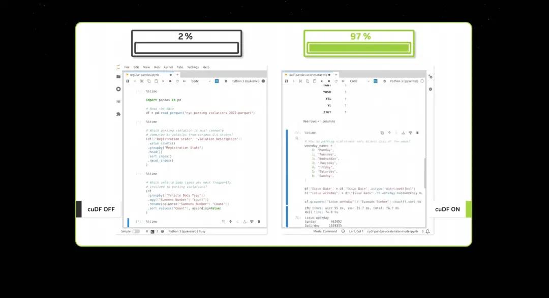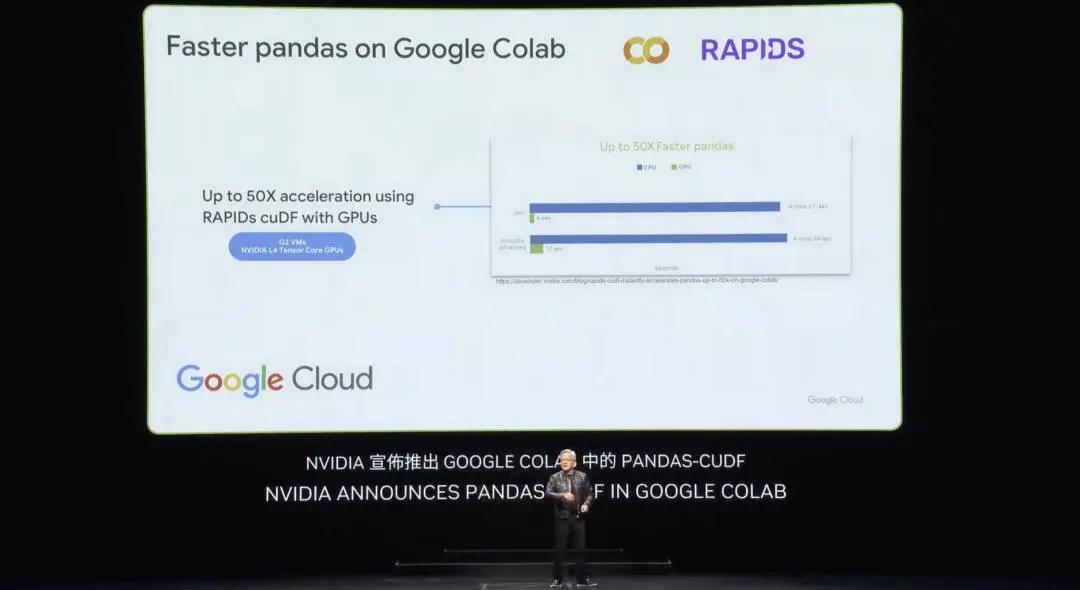 上周,Google 宣布在云端加速 Pandas,这是世界上最流行的数据科学库。你们中的许多人可能已经在使用 Pandas,它被全球 1000 万数据科学家使用,每月下载 1.7 亿次。它是数据科学家的电子表格。现在,只需点击一下,你就可以在 Google 云数据中心平台 Colab 中使用由 cuDF 加速 Pandas,加速效果真的非常惊人。