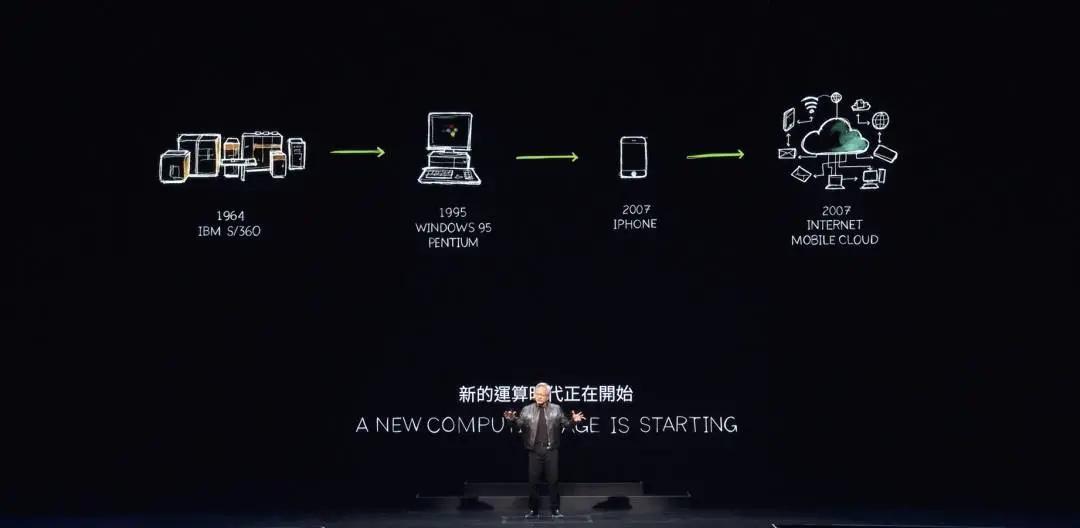 2007 年,iPhone 引入了移动计算,把计算机放进了我们的口袋。从那时起,一切都在连接并随时运行通过移动云。这 60 年来,我们只见证了两三次,确实不多,其实就两三次,主要的技术变革,计算的两三次构造转变,而我们即将再次见证这一切的发生。