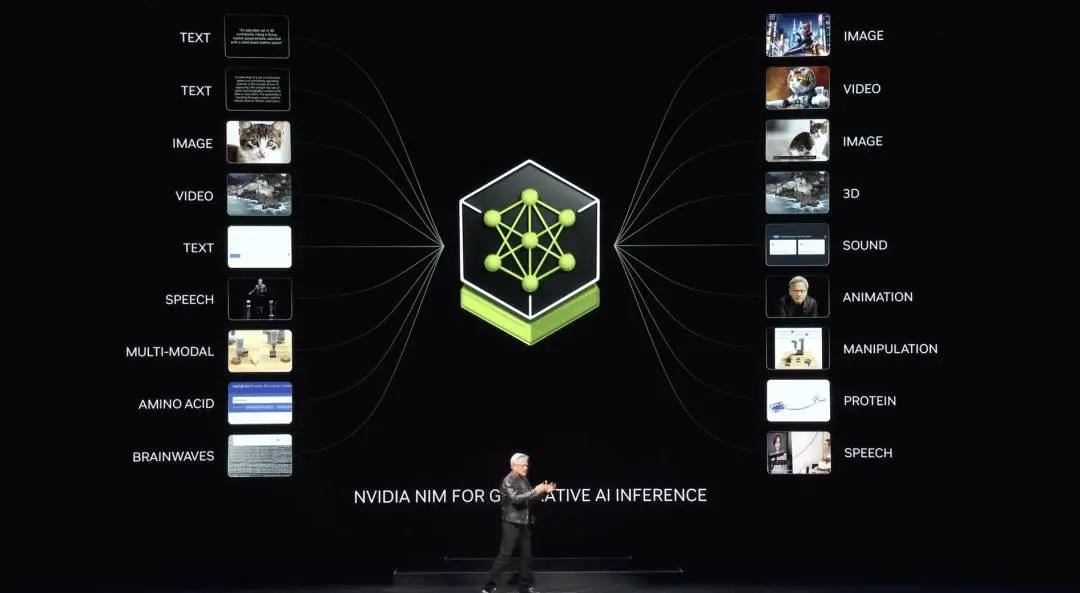 而不是一个生产软件的行业,这在 90 年代初是一个革命性的想法。记得微软创造的软件包装的想法革命化了 PC 行业。没有包装软件,我们会用 PC 做什么?它驱动了这个行业,现在英伟达有一个新的工厂,一个新的计算机。我们将在其上运行一种新的软件,称之为 NIMs,英伟达推理微服务。