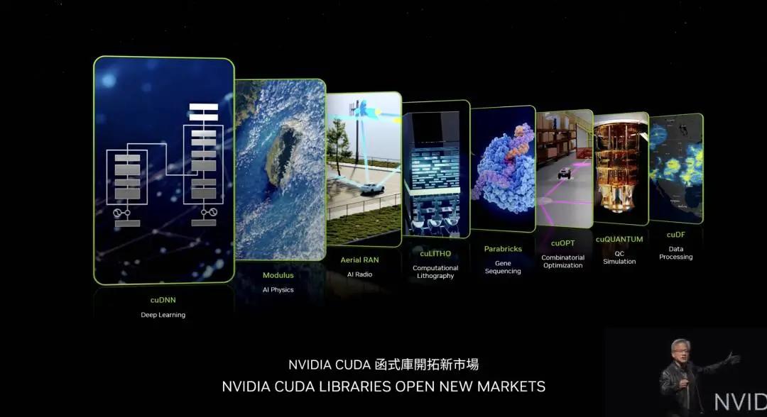 黄仁勋表示,英伟达必须创建这些库,以便让生态系统能够利用加速计算。如果英伟达没有创建 cuDNN,光有 CUDA 是不可能让全世界的深度学习科学家使用的,因为 CUDA、TensorFlow 和 PyTorch 中使用的算法之间的距离太远了。这几乎像是在没有 OpenGL 情况下做计算机图形处理,或者没有 SQL 的情况下进行数据处理。这些特定领域的库是英伟达的珍宝,总共有 350 个库。正是这些库使英伟达能够打开如此多的市场。