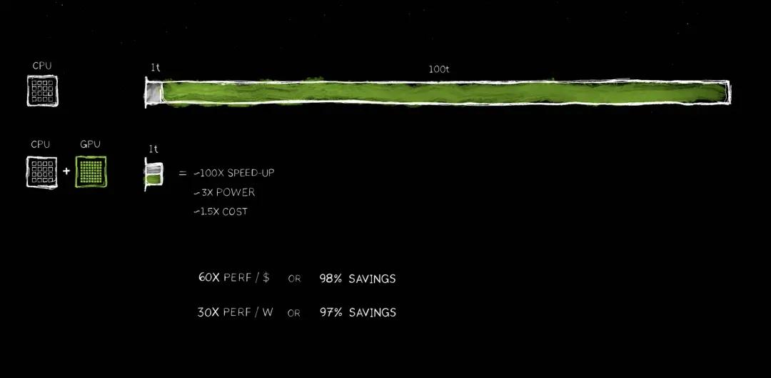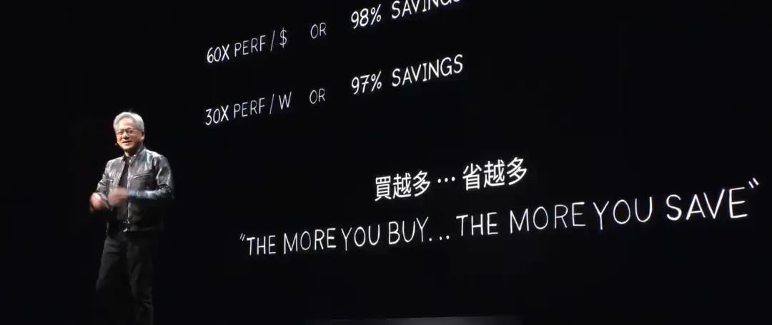 现在终于决定加速计算,有大量被捕获的损失可以现在回收,许多被保留的浪费可以从系统中释放出来。这将转化为金钱的节省和能源的节省,这也是为什么黄仁勋常说「买得越多,省得越多」。