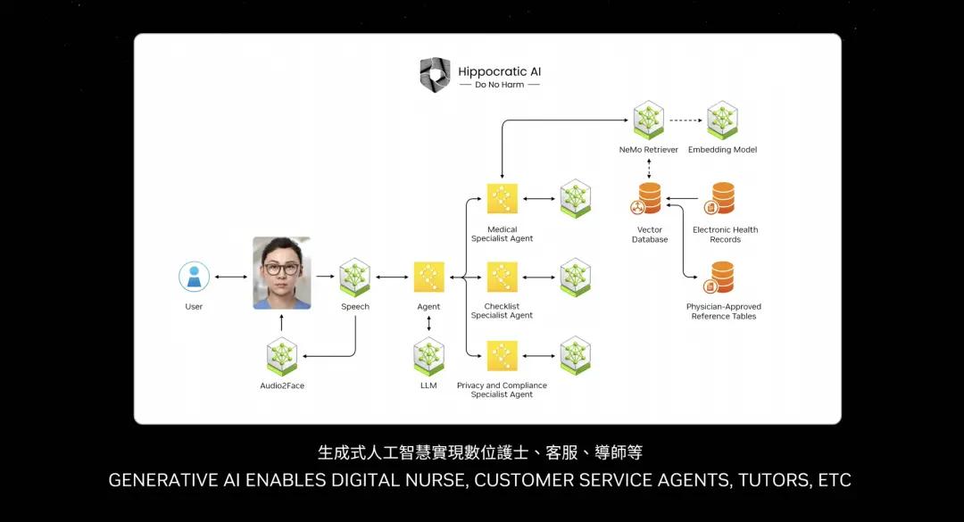 未来最重要的应用之一当然是客户服务。几乎每个行业都需要 Agent。这代表了数万亿美元的客户服务。护士在某些方面也是客户服务 Agent,一些非处方或非诊断性的护士基本上是零售业的客户服务,快速服务食品、金融服务、保险业。数以千万计的客户服务现在可以通过语言模型和 AI 增强。因此你看到的这些盒子基本上就是 NIMs。