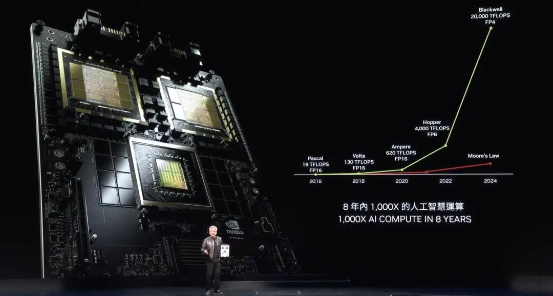 英伟达的每一代计算的浮点运算能力增加了 1000 倍。摩尔定律在八年内增长大约 40~60 倍。而在过去的八年里,摩尔定律的增长速度大大减慢。即使在摩尔定律最好的时候,也无法与 Blackwell 性能相比。