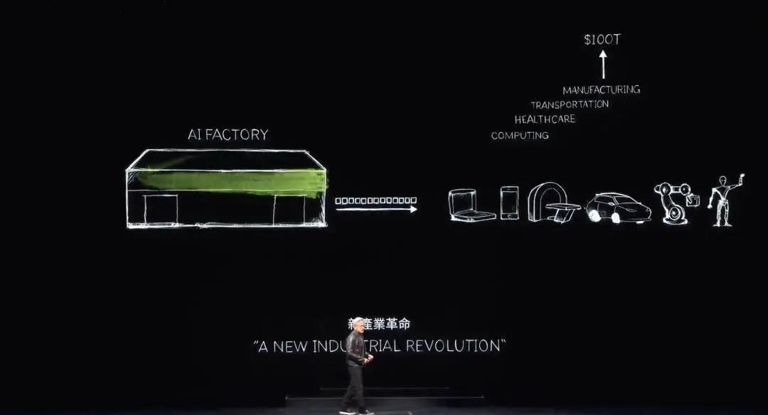 注意到每天都有这么多不同的生成式 AI 模型被发明出来。每个行业现在都在涌入。第一次,价值 3 万亿美元 IT 行业,正在创造一些可以直接服务于 100 万亿美元产业的东西。不再只是信息存储或数据处理的工具,而是一个为每个行业生成智能的工厂。这将成为一个制造业产业,但不是计算机制造业,而是使用计算机进行制造业。