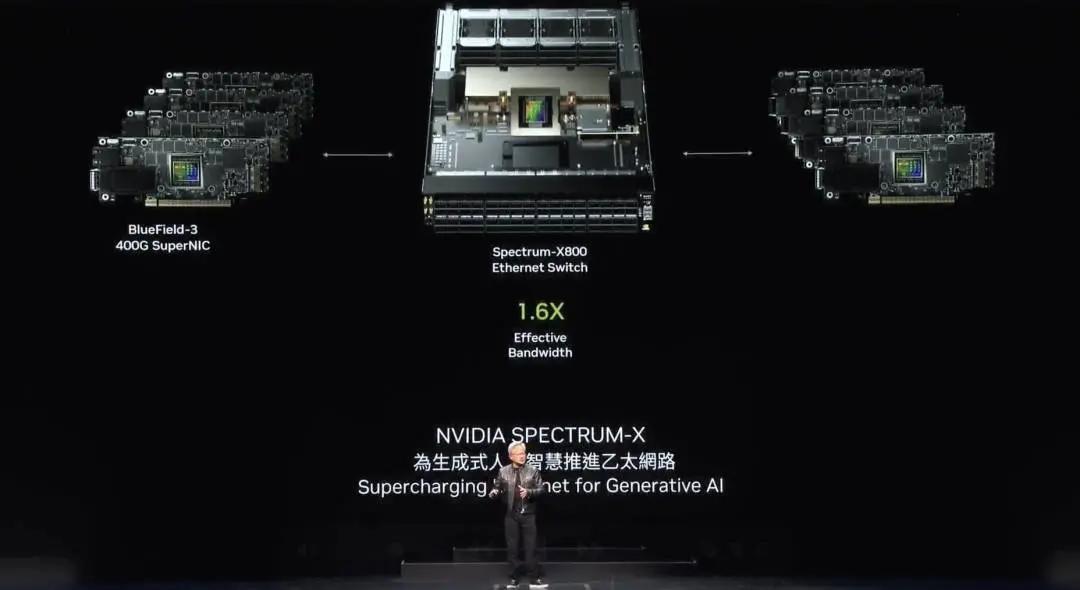 英伟达有一整条 Ethernet 产品线。这是 Spectrum X800,速度为每秒 51.2Tbps,256 个端口。接下来的是 512 个端口,明年推出,称为 Spectrum X800 Ultra,再接下来是 X16。重要的理念是 X800 设计用于成千上万个 GPU,X800 Ultra 设计用于数十万个 GPU,X16 设计用于数百万个 GPU,数百万 GPU 数据中心时代即将到来。