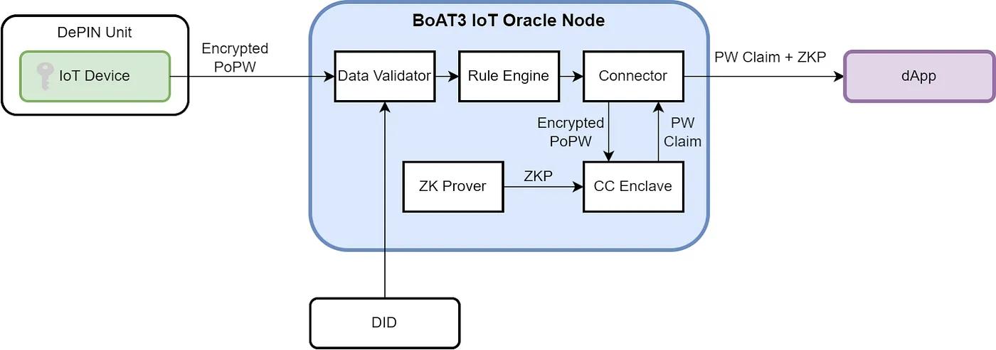 - 隐私保护:隐私保护是 DePIN 项目的基石之一。如果原始 PoPW 包含敏感信息,在离开物联网设备之前,必须对其进行加密。BoAT3 物联网预言机集成了机密计算环境和零知识证明(ZKP)技术,以允许敏感数据在可信环境中处理,并生成结果真实性的 ZKP 证明。