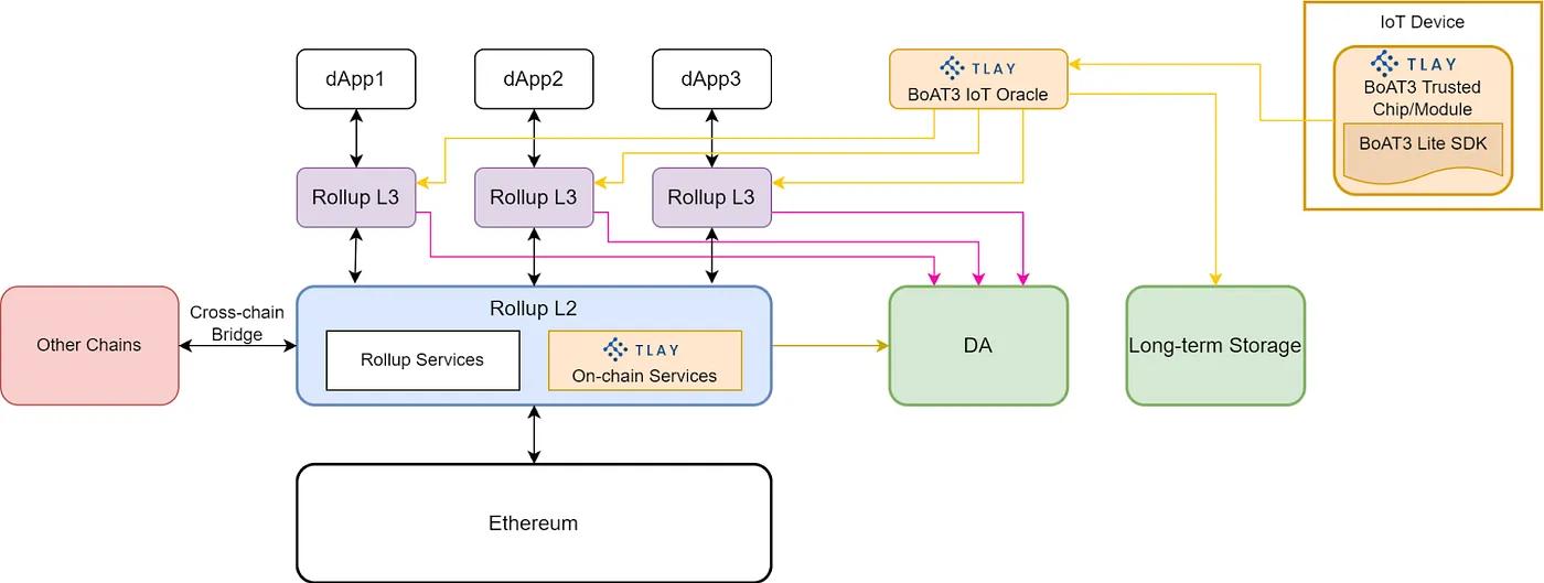 TLay 的产品整合了核心功能,包括 BoAT3 可信芯片 / 模组、BoAT3 Lite/Agent SDK、BoAT3 物联网预言机服务和 DePIN 应用链(Appchain),以及 DePIN MVP 启动支持。BoAT3 可信芯片 / 模组用于快速将多种 IoT 设备转化为支持 DePIN 功能的设备,大大减少了实现 DePIN 化的难度和时间成本。BoAT3 物联网预言机是一种专为 DePIN 场景构建的去中心化预言机,确保 DePIN 单元生成的可验证数据被可靠地记录在链上。TLay DePIN 应用链是一种与 EVM 兼容的应用链,采用 Rollup 架构,实现高性能和低成本的数据处理。TLay 家族简化了 DePIN 的开发过程,帮助开发者和初创团队快速启动项目。