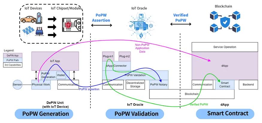 对于每个 DePIN 项目来说,准确地测量、可靠地报告和有效地验证 DePIN 单元的物理工作是必不可少的。一个 DePIN 单元是指执行物理工作的设施。例如,对于一个无线网络单元,PoPW 是它传输的字节数;对于一个太阳能发电单元,PoPW 是它生成的能量。物理工作(PW)代表了某些现实世界资产的状态或价值。 无论确切的测量标准是什么,DePIN 单元通常配备了物联网设备,以测量和报告 PoPW,这些数据由网络验证。与区块链原生数据不同,PoPW 是链外数据,因此需要一个物联网预言机来安全地将 PoPW 传输到区块链上,以进行贡献评估。