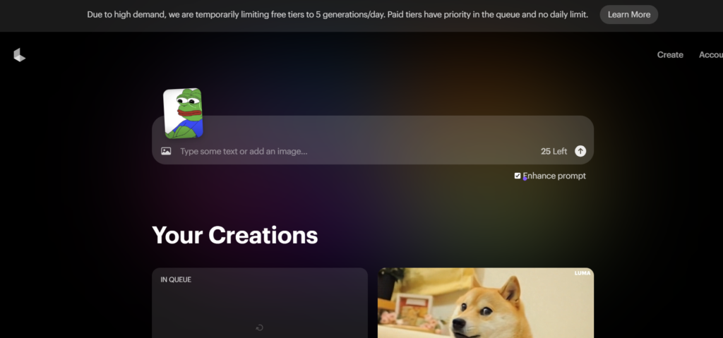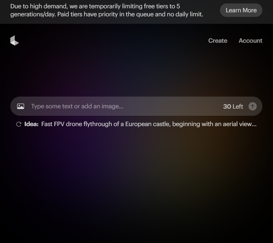 - Luma Dream Machine 登入后,在画面中的输入栏位输入文字或上传图片。