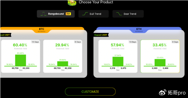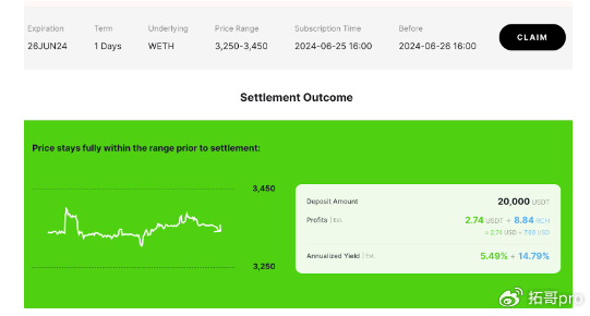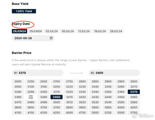 比如我在6月25日16:00 投入资金,6月26日16:00到期,25日16:00—26 日 16:00 之间 ETH价格在我所选的范围内那我可以获得更高收益,如果24小时内 ETH价格高于或低于我所选择的区间,则我只能拿到基础收益。