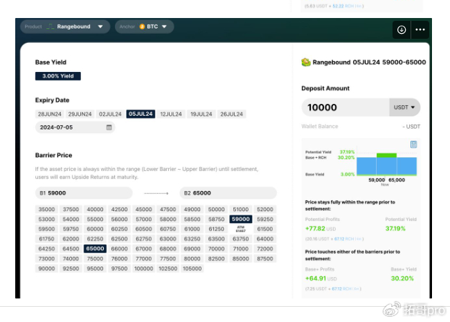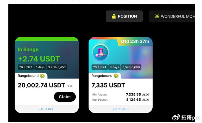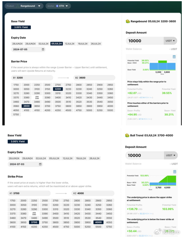 如果某种标的资产(例如比特币)在交易期间内(美式期权)保持在两个设定价格(上下限)之间,则 Rangebound 产品可以帮助赚取额外的收益。用户可以自己定制范围:范围越窄意味着利润更多但风险将会提高,范围更宽意味着利润更少但获胜的几率更高。如果用户购买的是 Earn 协议,则即使资产价格超出上下区间范围,你仍然可以获得最低基础收益(Base Yield)和 RCH 空投。