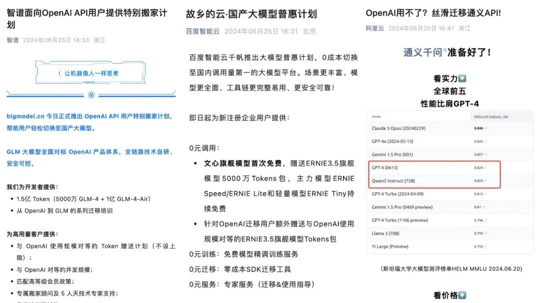 面对Open AI的“断供”,这一次国内企业的反应可谓是相当积极。在消息爆出的第一时间,智谱AI、百度、阿里、腾讯等大模型企业便纷纷推出了对于API服务的“搬家计划”,通过降价、简化流程等方式开始吸收此前使用OpenAI API服务的客户。