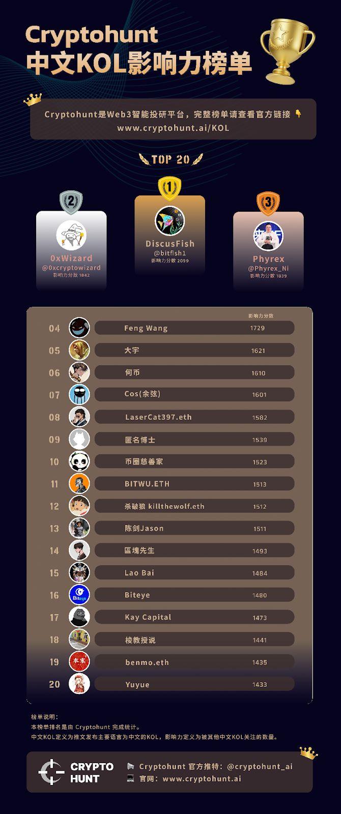 Web3智能投研平台@cryptohunt_ai 公布了中文KOL影响力榜单,综合评估了KOL的影响力并进行排序,里面有没有你喜欢的KOL呢? Biteye有幸排名第16,未来我们会继续提供更多前沿的研究,冲鸭!