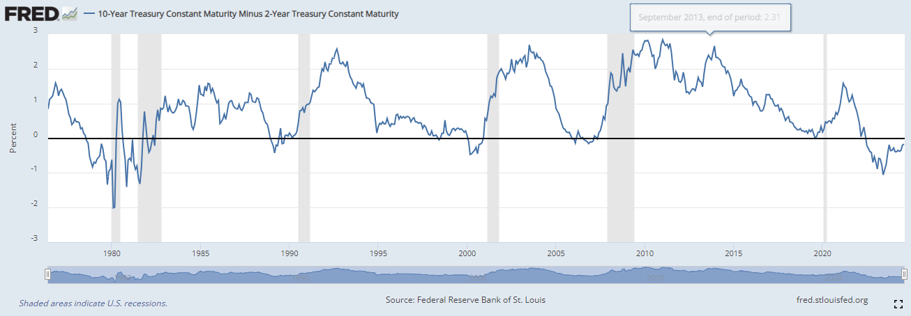 不过自 2022 年 7 月一路倒挂的殖利率曲线,创下有史以来最长的纪录,两年期和十年期国债之间的倒挂通常被认为是即将到来的衰退的信号,但市场由之前不断讨论美国即将「硬著陆」,到「软著陆」甚至「不著陆」,始终没有出现经济衰退的现象。